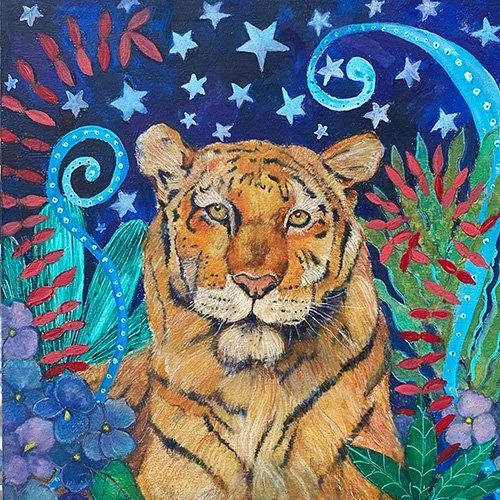 So why a Tiger? Well for a few reasons. Symbolically the Tiger represents strength and courage. I was also born under the Chinese zodiac of the Tiger (and this is also happens to be year of the Tiger). In terms of the rest of my painting, the African violets represent commitment, devotion and faithfulness. The stars represent divinity, guidance and protection. In many ways you are essentially looking at my furry self portrait.